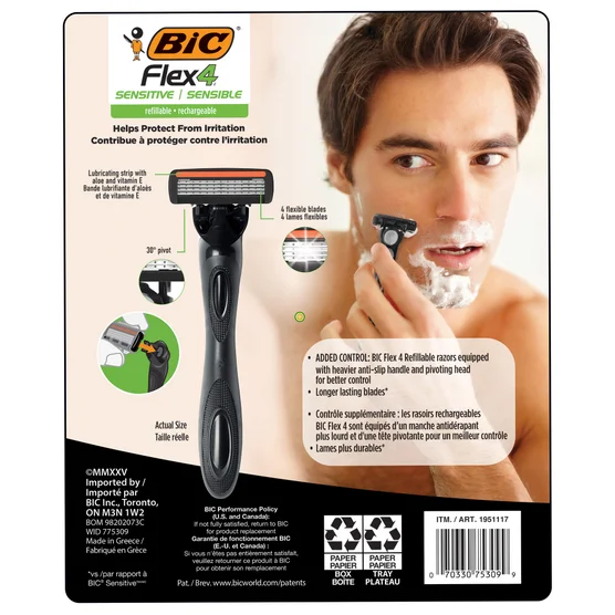 The BIC Flex4 Sensitive Razor Set delivers a smooth, precise shave designed for sensitive skin. This set includes 1 ergonomic handle and 24 refill cartridges, providing long-lasting convenience and excellent value. Each cartridge features a 4-blade system that flexes to the contours of your face and body, reducing nicks and irritation. The lubricating strip with aloe and vitamin E soothes and protects skin during shaving, leaving it soft and comfortable. Ideal for daily use, the BIC Flex4 Sensitive Razor ensures a close, irritation-free shave every time.