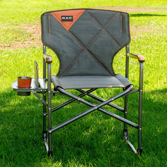 Elevate your outdoor comfort with this portable director chair featuring a lightweight aluminum frame, padded seat and backrest, and durable polyester fabric. The fold-out side table includes built-in cup and tablet holders, while wood-effect armrests add a premium touch. Folds compactly for easy transport and storage.