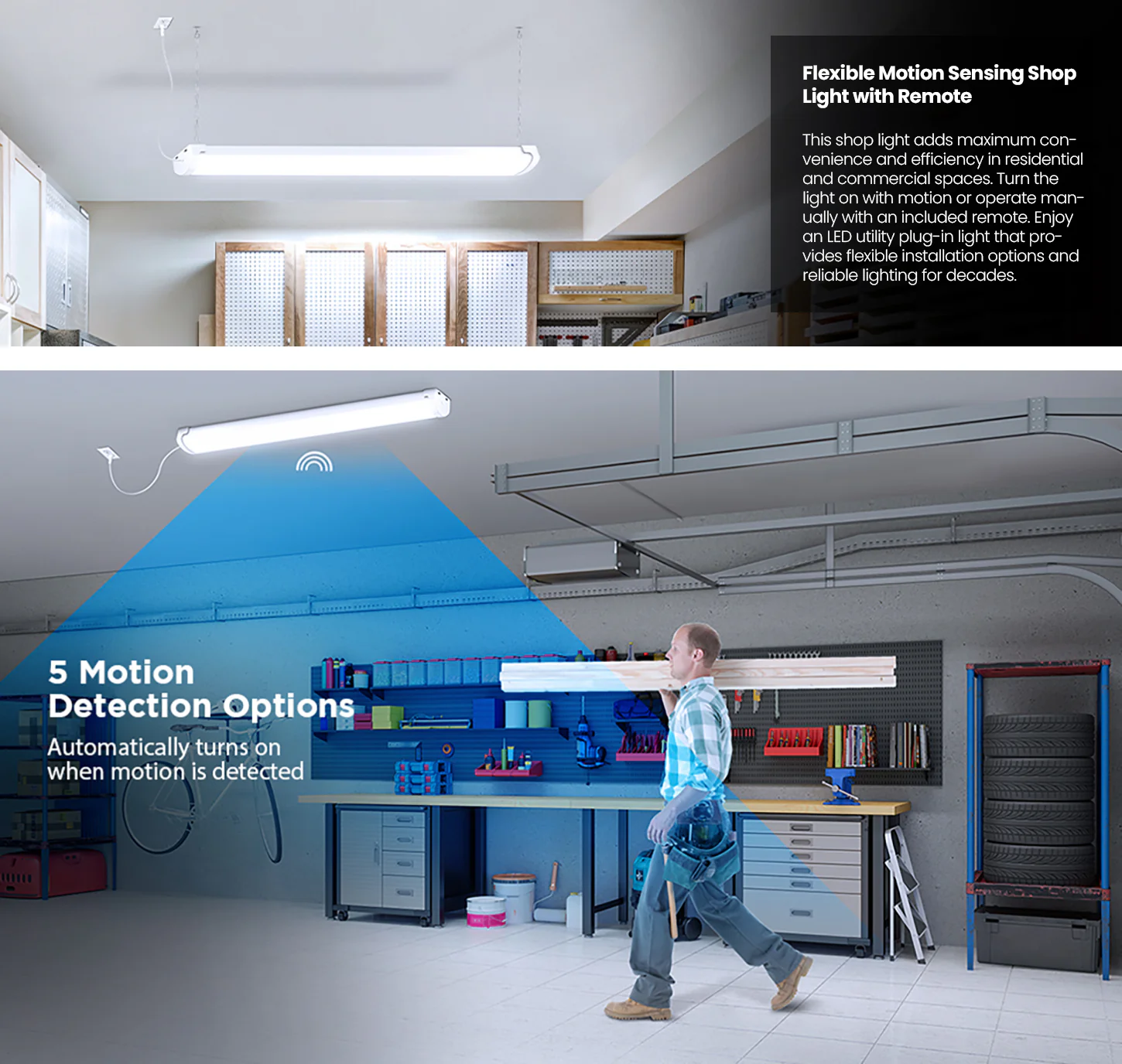 Motion Sensor Integrated LED Shop Light is a bright, linkable LED shop light with a built-in motion sensor and remote control. Delivering 5000 lumens of daylight white light, it’s ideal for garages, workshops, and storage areas, offering hands-free operation and customizable settings.