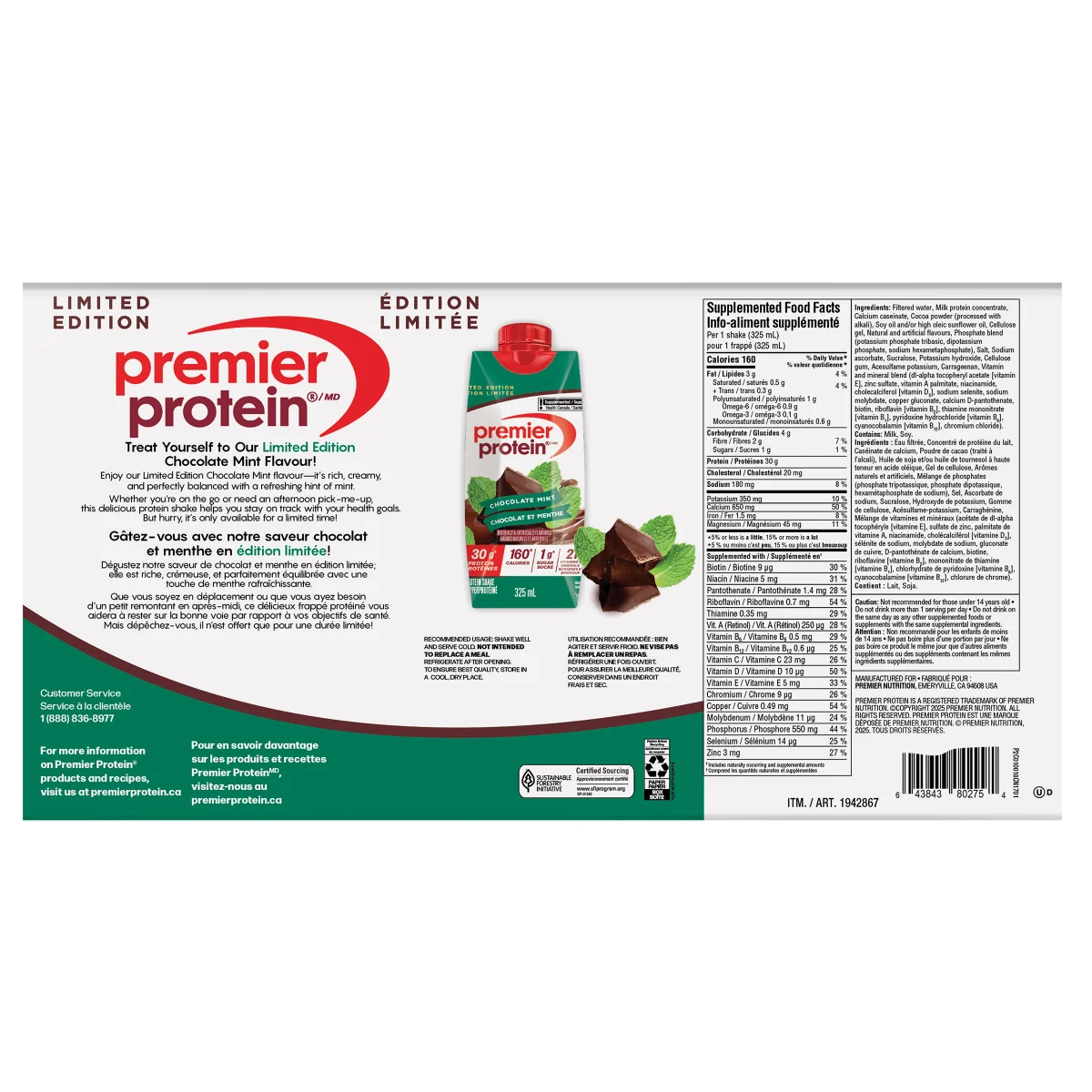 Refresh your routine with the Premier Protein High-Protein Chocolate Mint Shake, a smooth and flavorful way to meet your daily protein needs. Each ready-to-drink 325 mL bottle provides 30g of high-quality protein to help support muscle building, recovery, and active lifestyles.