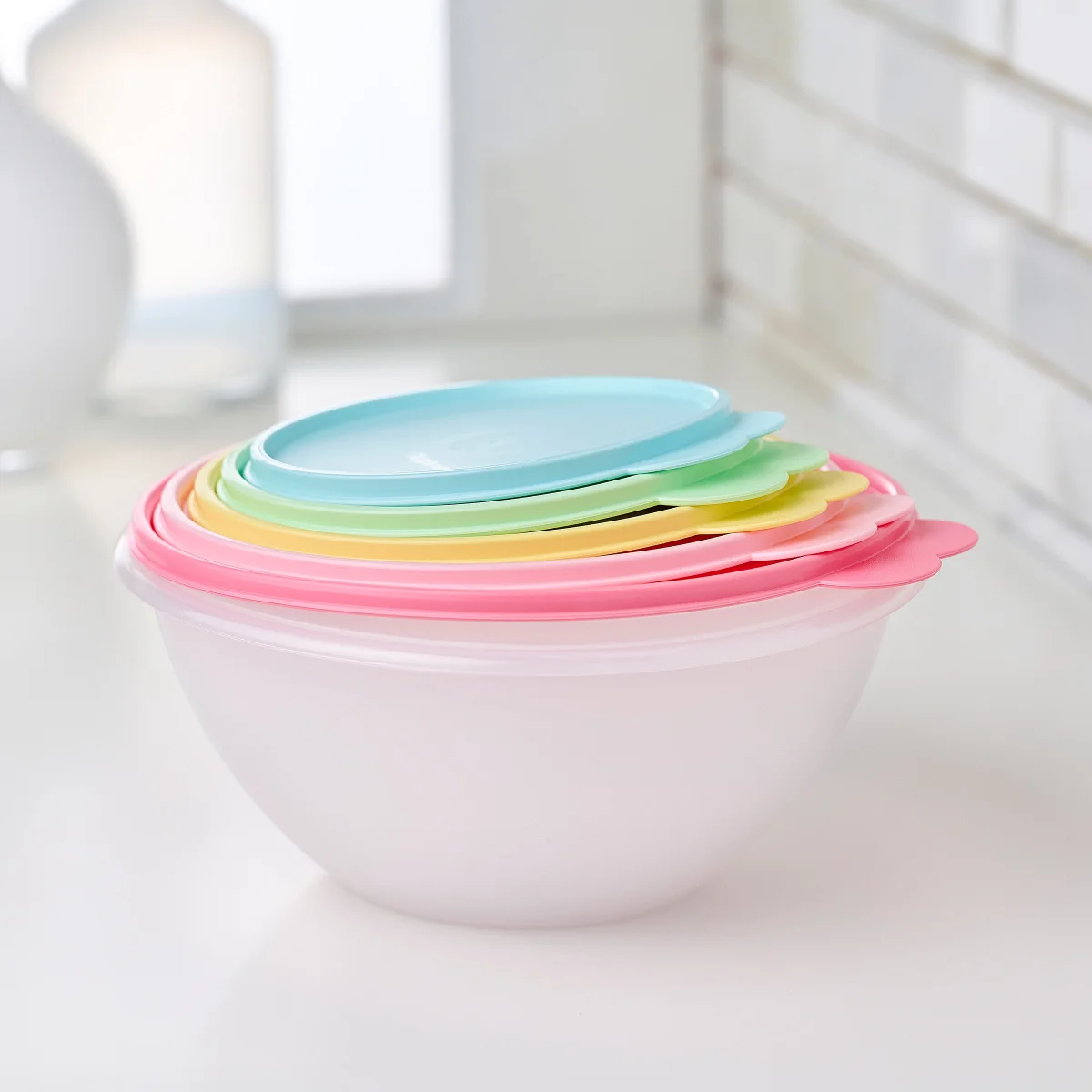 The Tupperware Wonderlier Food Storage Containers 5-Piece Bowl Set features nesting bowls with airtight lids for versatile food prep, storage, and serving. Made from durable, BPA-free materials, these bowls have scratch-resistant interiors and are dishwasher safe.