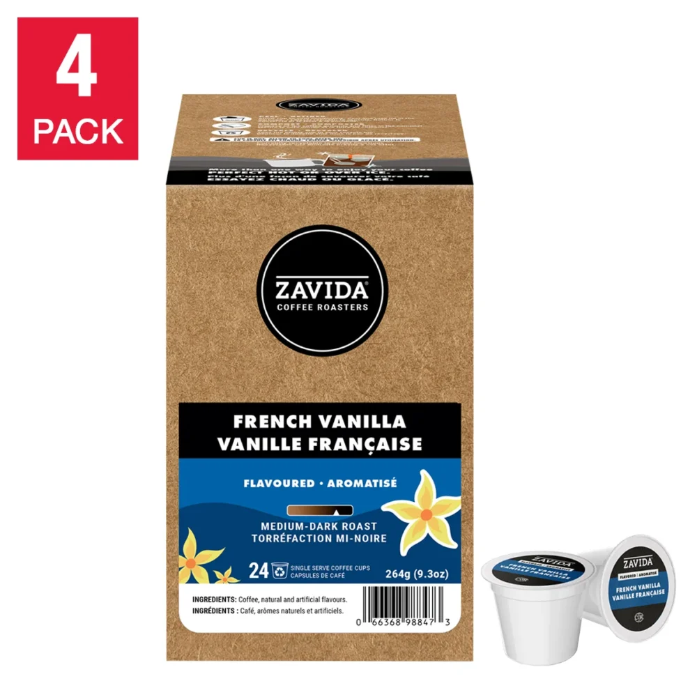 Perfect for home or office, this Zavida French Vanilla Coffee KCup Pods, 96-count pack includes 4 boxes of 24 pods. Compatible with most K-Cup® brewing systems, these coffee pods are Halal and Kosher certified for a premium coffee experience every time.