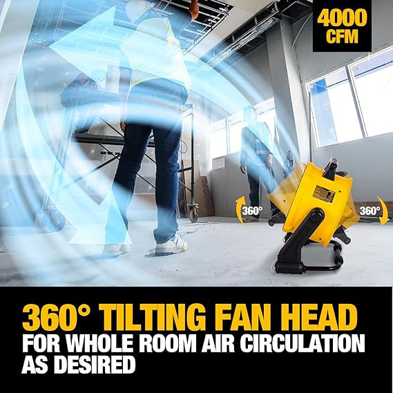 The 135W high-efficiency motor provides dependable performance while maintaining noise levels at or below 60 dB(A), making it powerful yet relatively quiet for its class. The 360° adjustable tilt lets you direct airflow exactly where it’s needed, while the sturdy steel frame and carry handle make it easy to move between job sites or rooms.