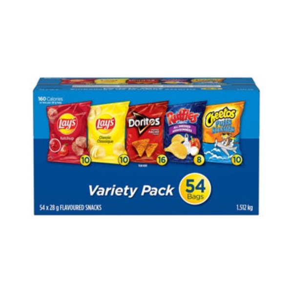 GREAT FOR ON-THE-GO: The Frito-Lay Variety Pack keeps snacking simple and convenient wherever you are. With 54 individual 28 g bags, you can grab a quick bite anytime hunger hits. Because each pack is perfectly sized, it fits easily in lunch boxes, road trip bags, or office drawers—so your favourite snacks stay fresh and ready to enjoy.