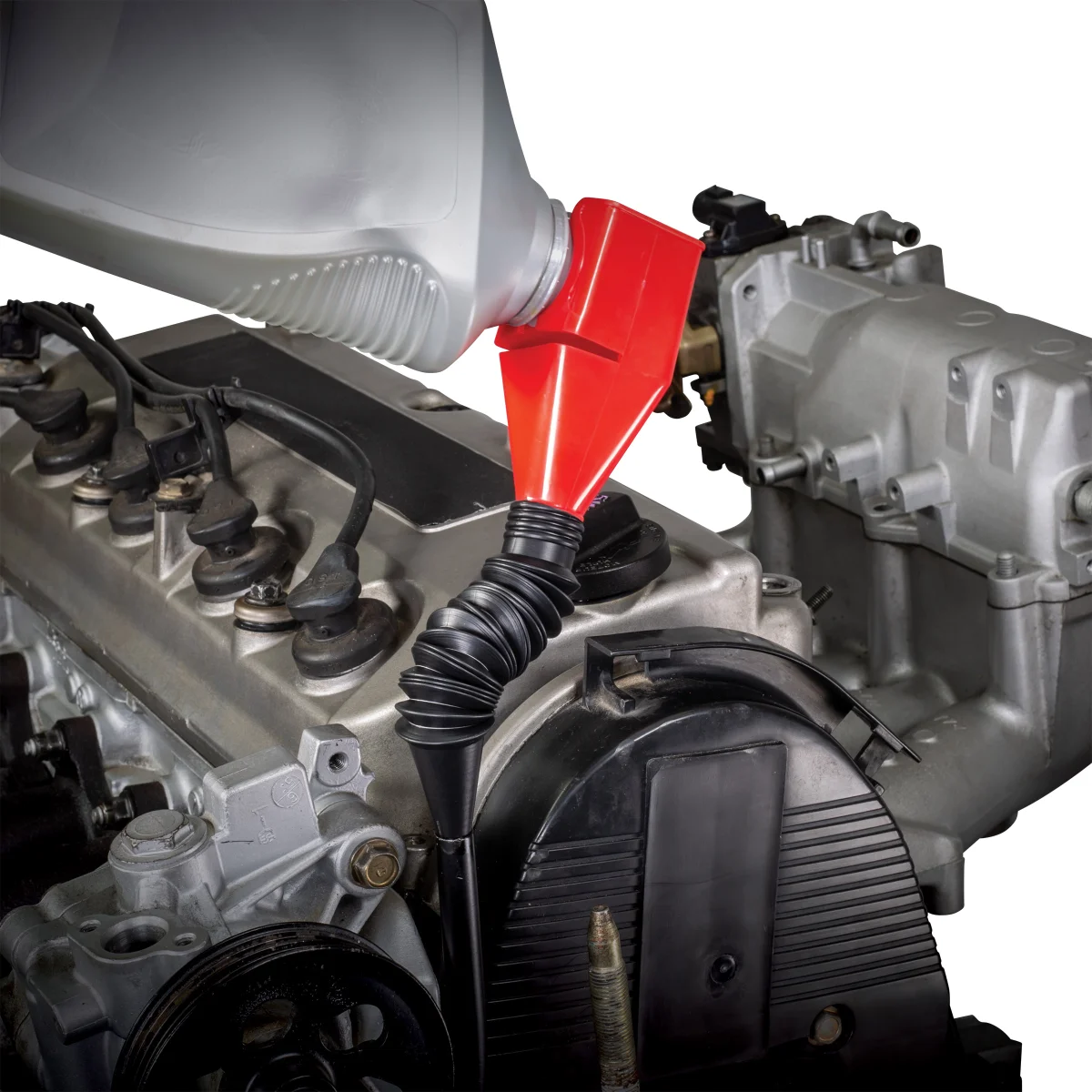 Clean Oil Fill: Flexible bending funnel plus mini quart bottle pour spout for precise, no-spill filling.