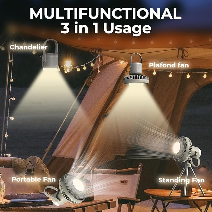 Designed for on-the-go use, the fan features a convenient handle and anti-slip tripod for secure, versatile placement. Compact yet durable, it’s easy to carry and ideal for tents, patios, or any outdoor space.