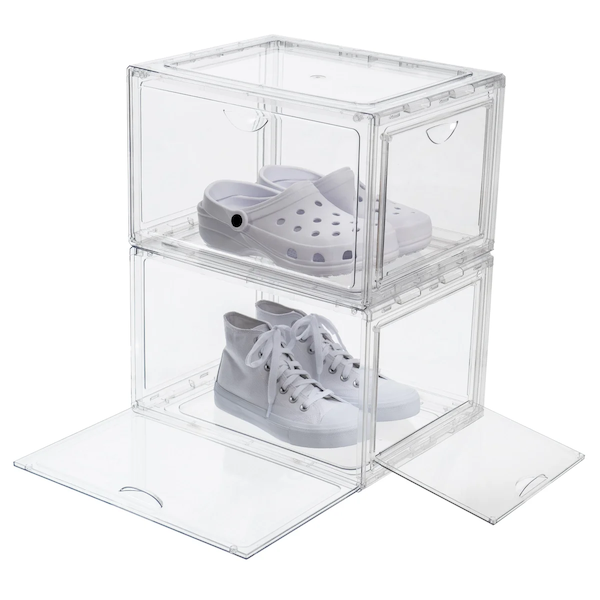 Elevate your home organization with the Stackable Shoebox & Organizer, 4-pack. Designed for both functionality and style, these organizers provide an ideal storage solution for shoes, collectibles, and other essentials. Made from high-quality, transparent PET material, these boxes allow you to easily view and access your items while protecting them from dust and moisture.