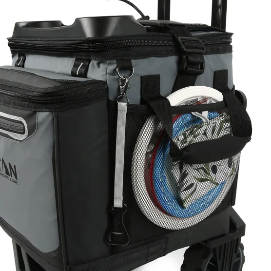 The rugged construction features heavy-duty zippers, a reinforced frame, and a telescoping handle with smooth-rolling wheels for effortless transport, even when fully loaded. Its spacious interior holds up to 60 cans, plus additional room for ice packs or food items. Multiple compartments and exterior pockets make organization easy, keeping essentials within reach.